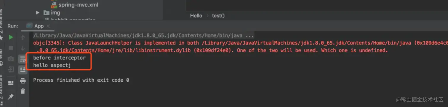 针对test()方法进行拦截,方法执行前打印"before interceptor"