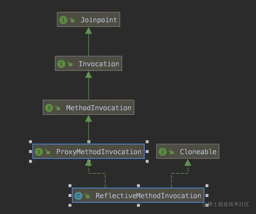 目标对象:ReflectiveMethodInvocation,在JdkDynamicAopProxy invoke方法中创建,是JoinPiont的一个实现。