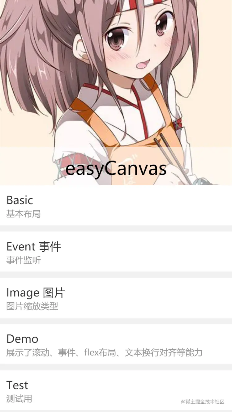 easy-canvas实现了在canvas中创建文档流,并且可以很轻松的支持组件化开发,并且没有第三方依赖,只要支持标准的canvas就可以使用,在实现基本功能的基础上添加了事件、scroll-view等支持。基础版支持小程序、web。