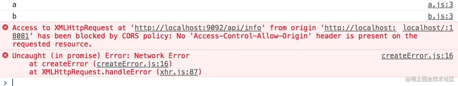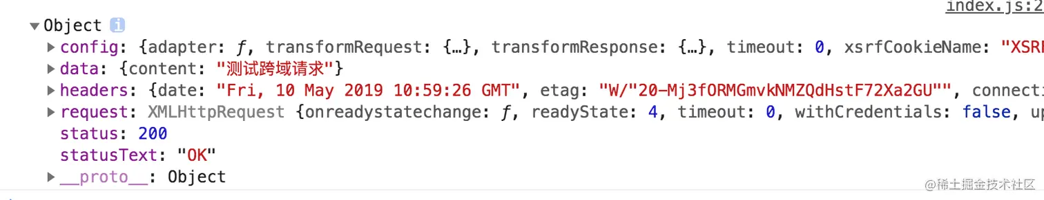 我们可以看到结果实际上是跨域了 在正式环境我们会用cors或者nginx代理,在开发环境webpack-dev-server也提供了代理功能,可以做代理处理