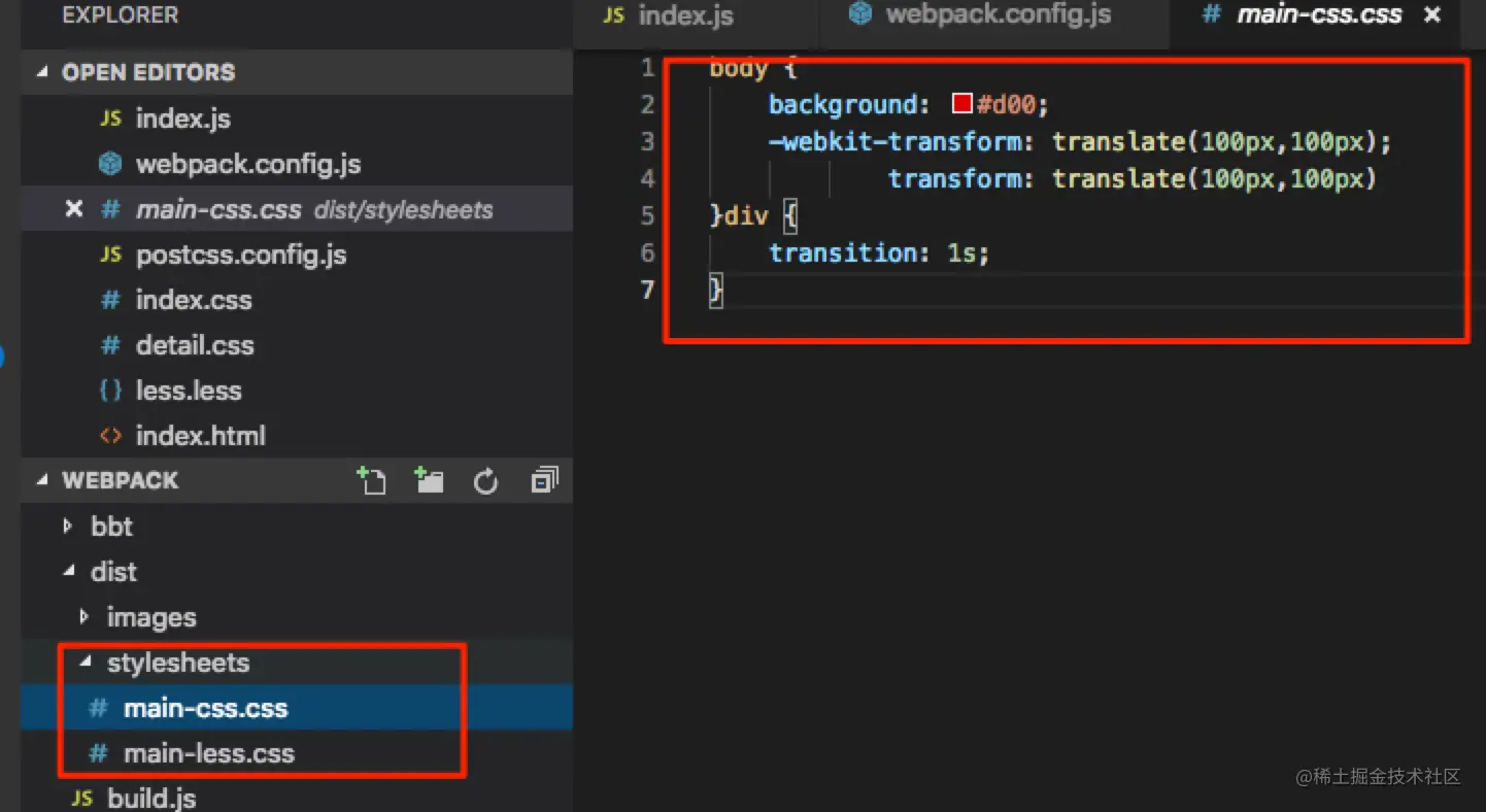 // 我们再创建个css文件 在index.js中引用 然后进行编译 会发现生成了两个css文件 一个是css后缀打包的文件,一个是less后缀打包的文件 也就是说我们在index.js引入的两个css后缀的文件被放到了一个文件中