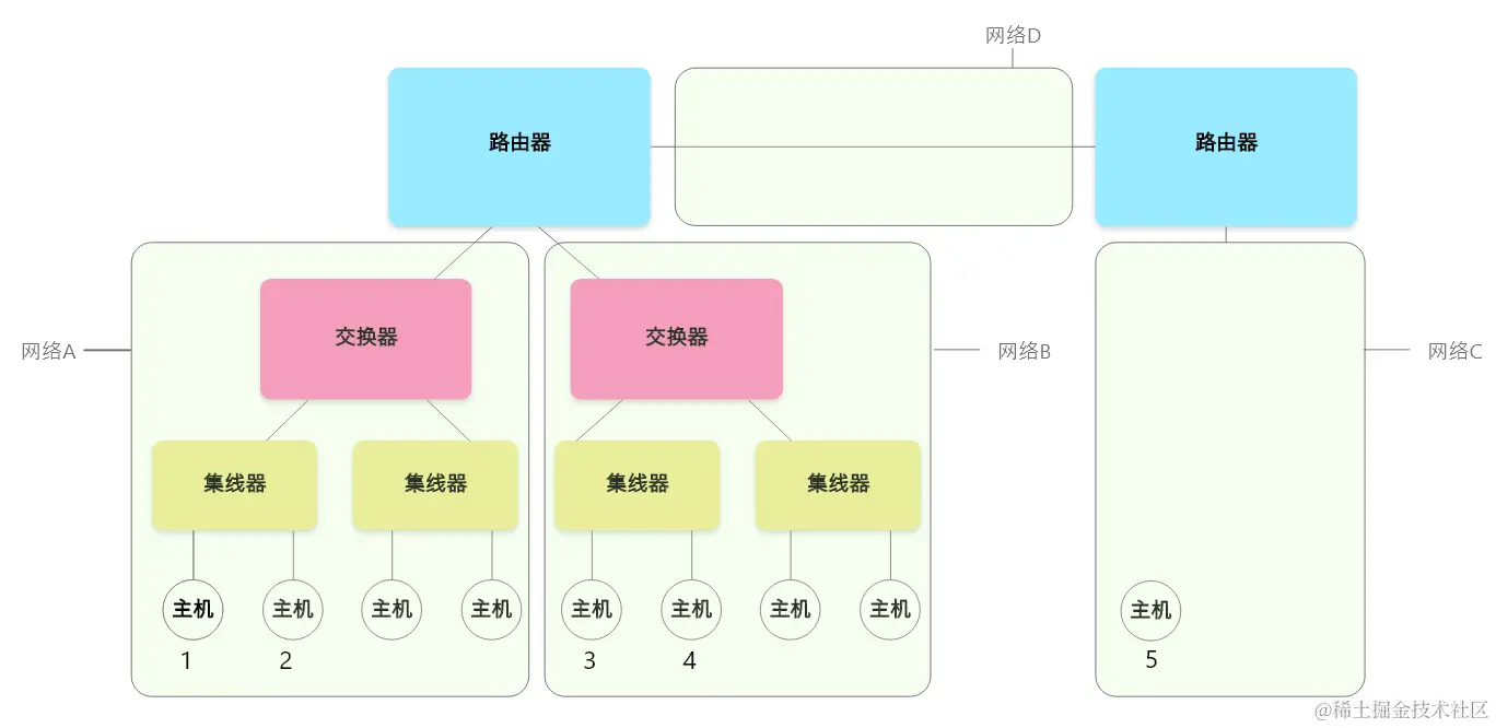 - 左路由器发送给主机5:使用路由器中的ARP找到相邻路由器左边那个端口的MAC地址