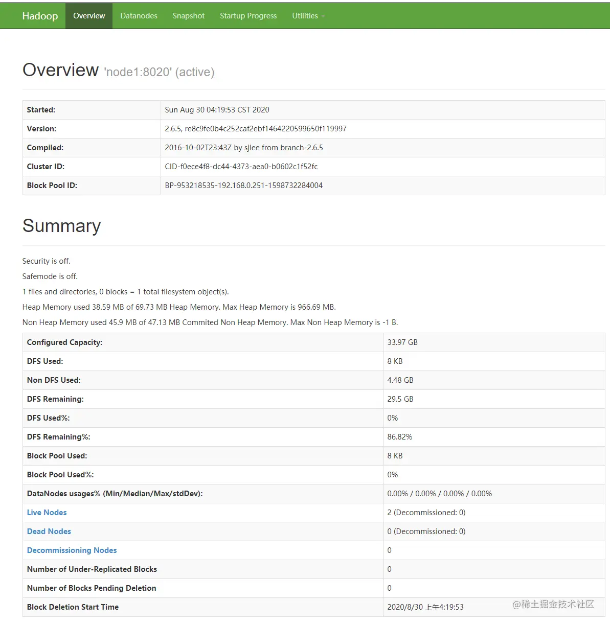- 最终查看50070端口和8088端口正常一般就都ok了,我就没去做杀掉某个namenode或者resourcemanager的测试了,需要的可以自行测试;