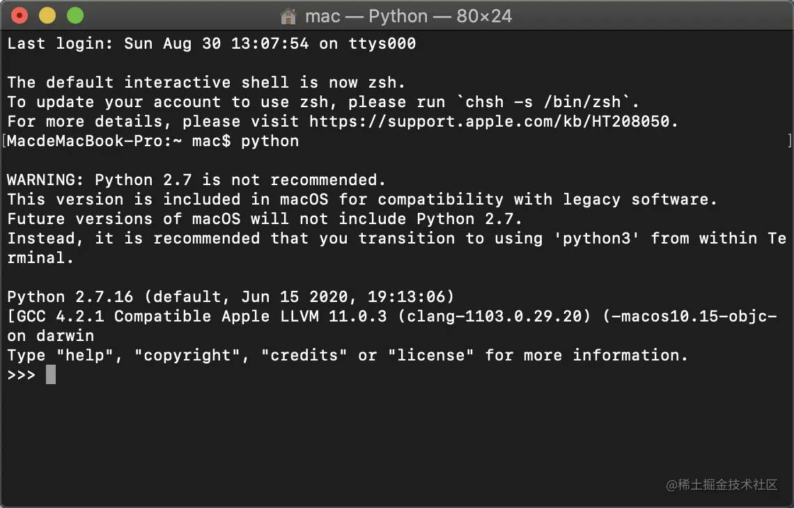 mac 电脑自带 python,但版本是 python2,输入 python 命令查看版本,可以看到版本是 2.7.16,或者输入 pythons3 --version