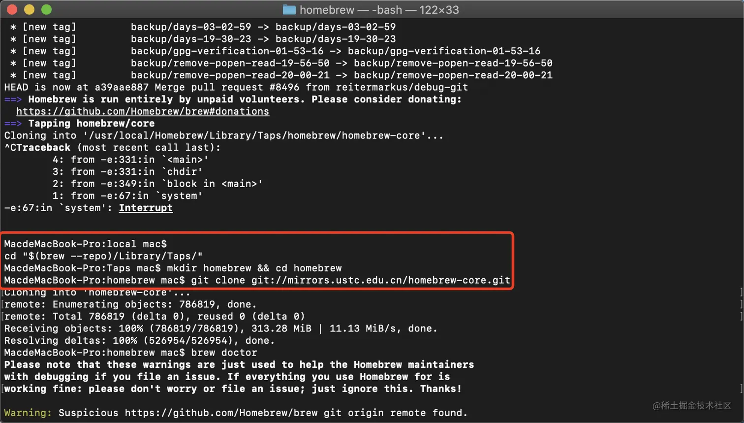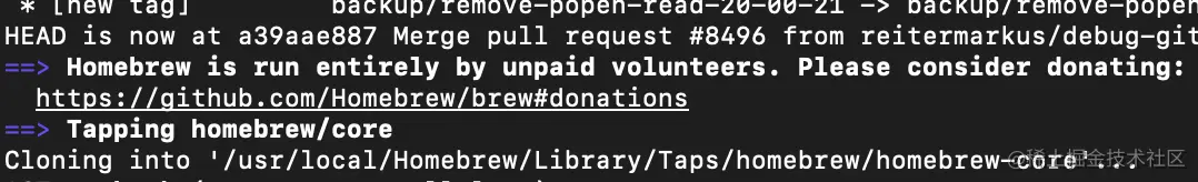 因为我之前按其他方式操作过,下载了些东西,所以这步有报错fatal: destination path '/usr/local/Homebrew/Library/Taps/homebrew/homebrew-core' already exists and is not an empty directory.