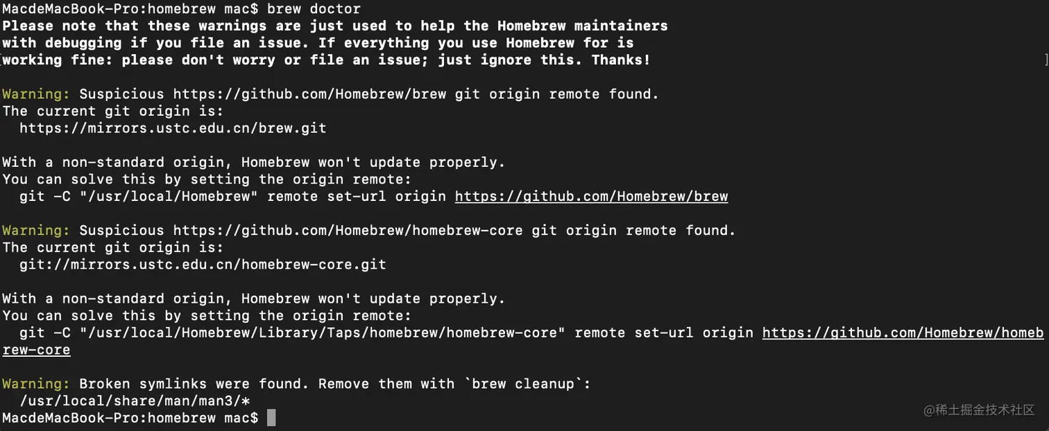 安装完成后,你可以用 brew doctor 检查一下是否安装成功