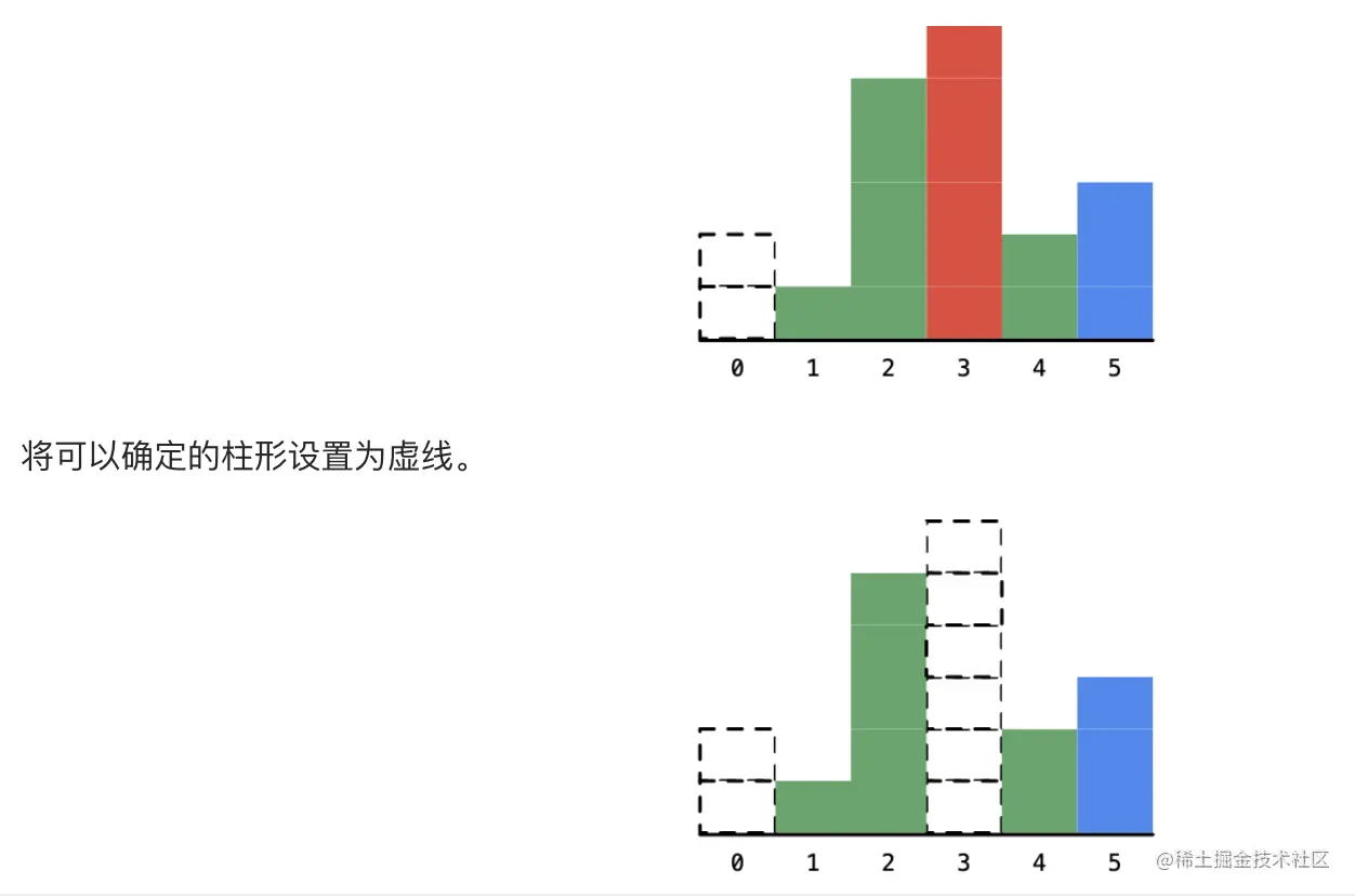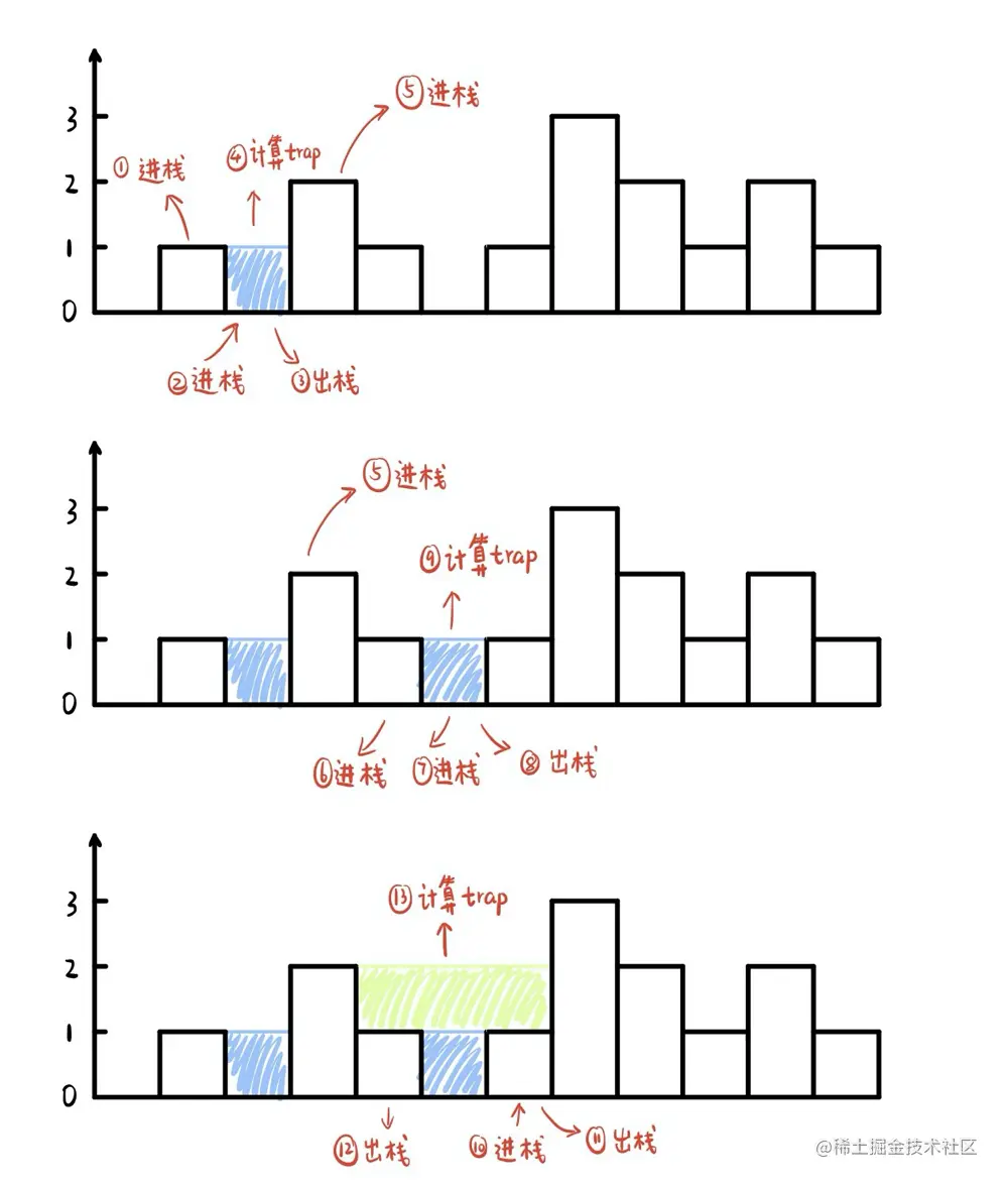 while (!st.empty() && height[st.top()] < height[i])//遇到一个高的,会把前面所有矮的都算完,然后这个高的变成比top矮的后又入栈