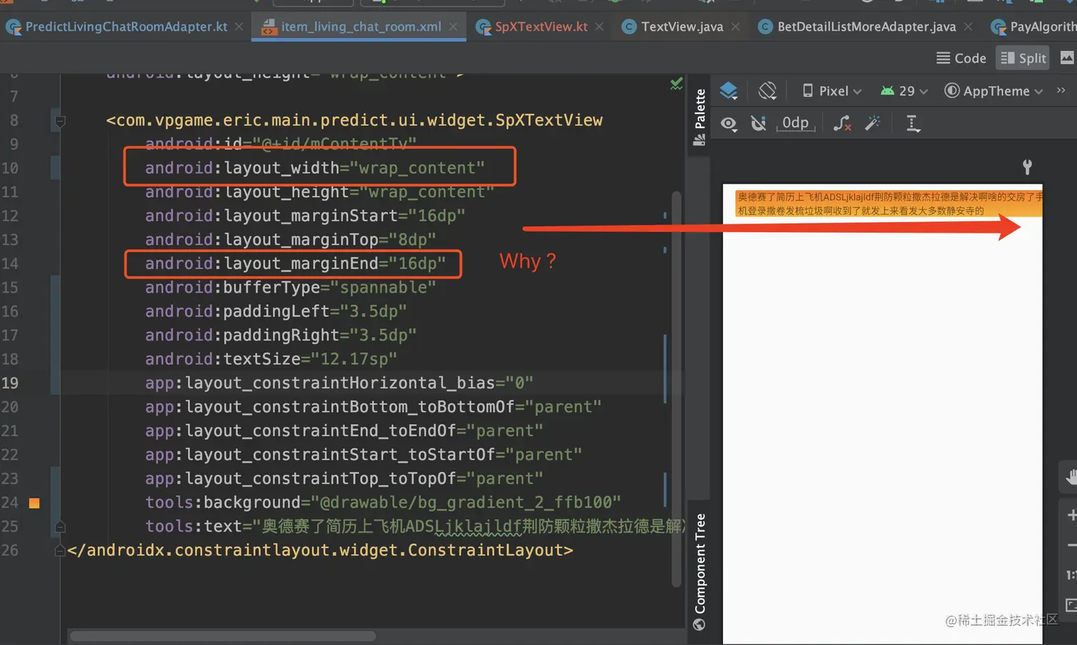 ConstrainLayout布局中wrap_content和margin_end同时使用的坑 Jafar2022 2020-08-30 185 阅读1分钟 今天尝试在TextView中使用wrap_content和margin_end 发现了问题一:当文字超出屏幕之后,margin_end竟然没起作用。。我勒个去 为毛我设置了margin不起作用? 不清楚。。。 但是设置了 app:layout_constrainedWidth="true" 就好了