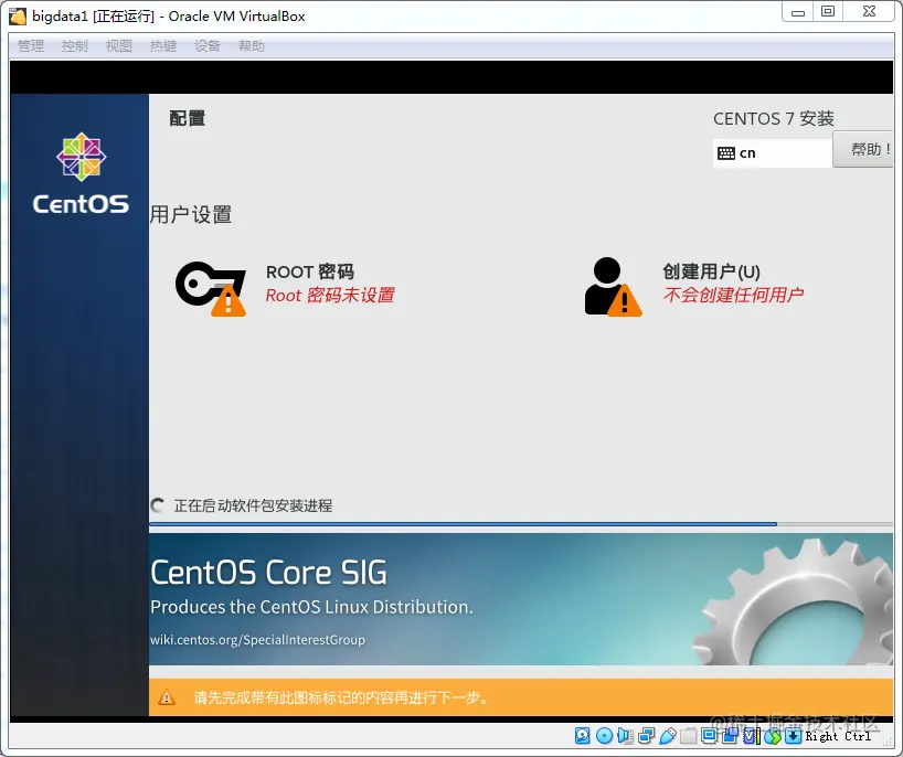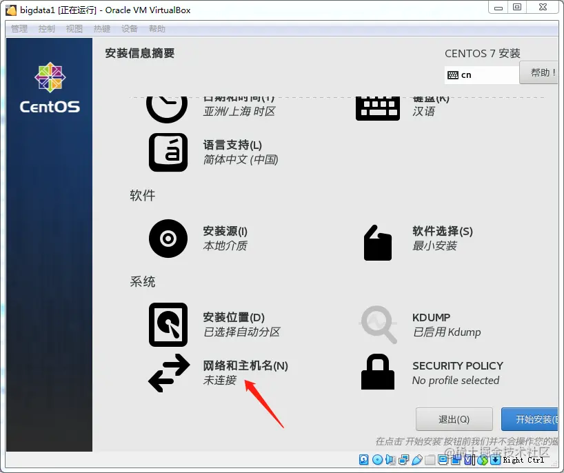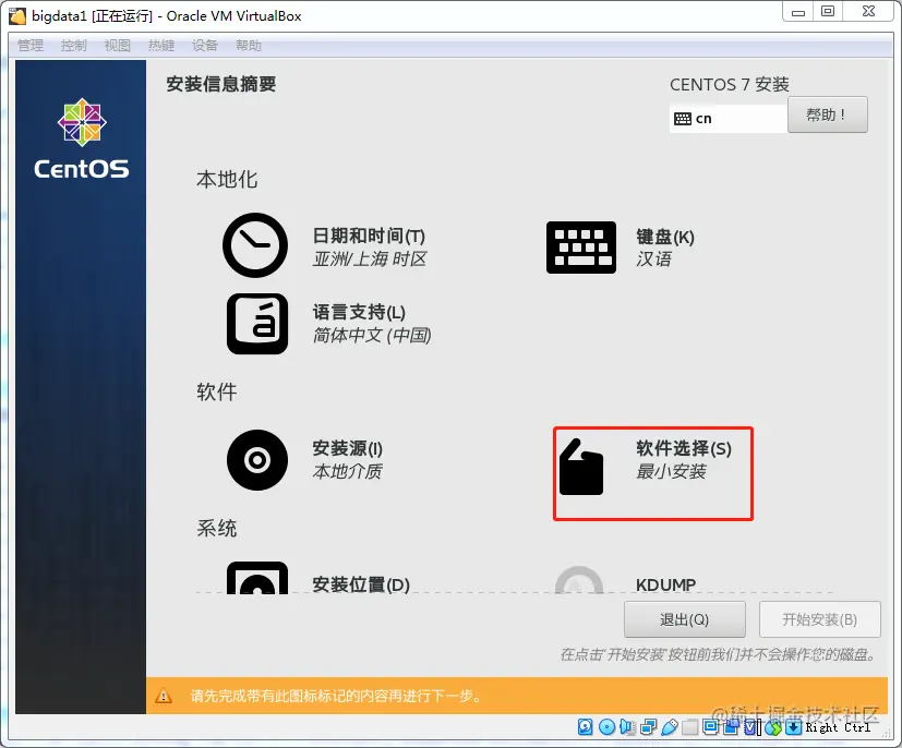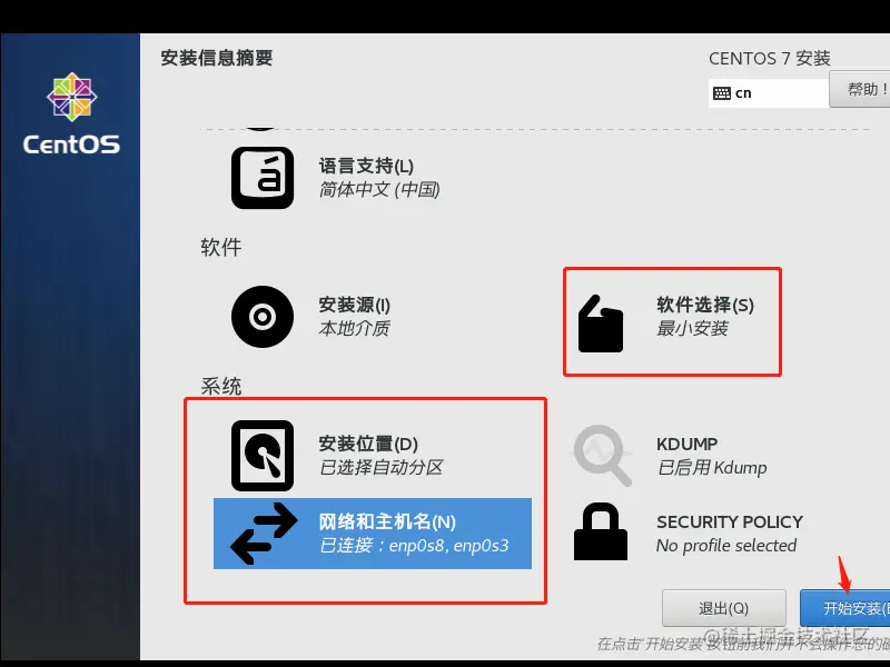 由于我下的是 CentOS Minimal 版,所以这里只有最小化安装,好处就是安装速度快,确定就是一些常用软件需要自己安装,比如 ifconfig、wget等