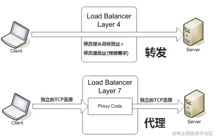 以常见的 TCP 为例,负载均衡设备如果要根据真正的应用层内容再选择服务服务器,只能先代理最终的服务器和客户端建立连接(三次握手)后,才可能接收到客户端发送的真正应用层内容的报文,然后再根据报文中的特定自带,再加上负载均衡设备设置的服务器选择方式,决定最终选择的内部服务器。 负载均衡设在这种情况下,更类似于一个代理服务器 。负载均衡和前端的客户端以及后端的服务器会分别建立 TCP 连接。所以从这个技术原理上来看,七层负载均衡明显对负载均衡设备的要求更高,处理七层的能力也必然会低于四层模式的部署方式。