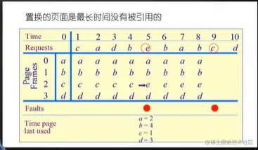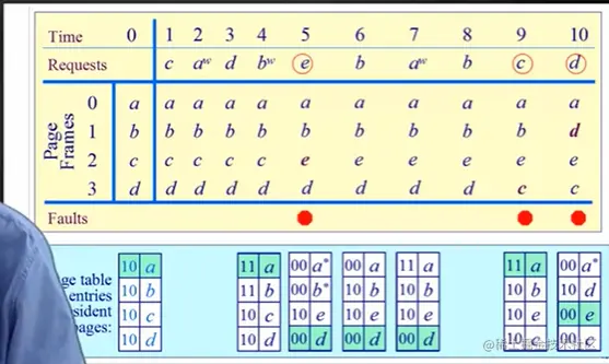 - 利用页表的access bit 初始位为0,访问置1,组织成环形列表,把指针指向最老页面。缺页中断时,考查指针指向的最老页面,若为0,立即淘汰。若为1,把该位值为0,考查下一个位置。
