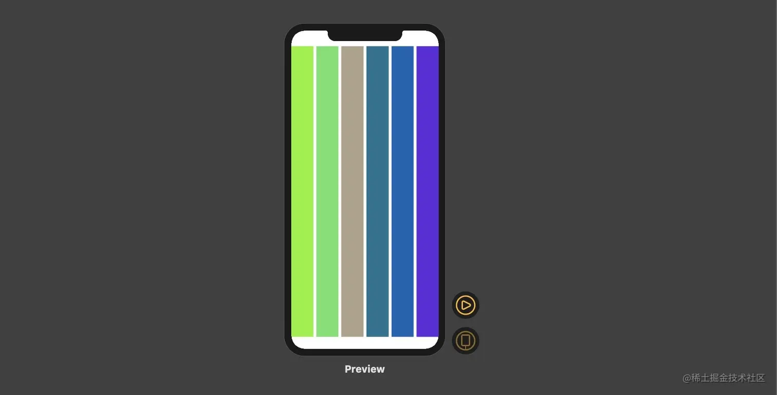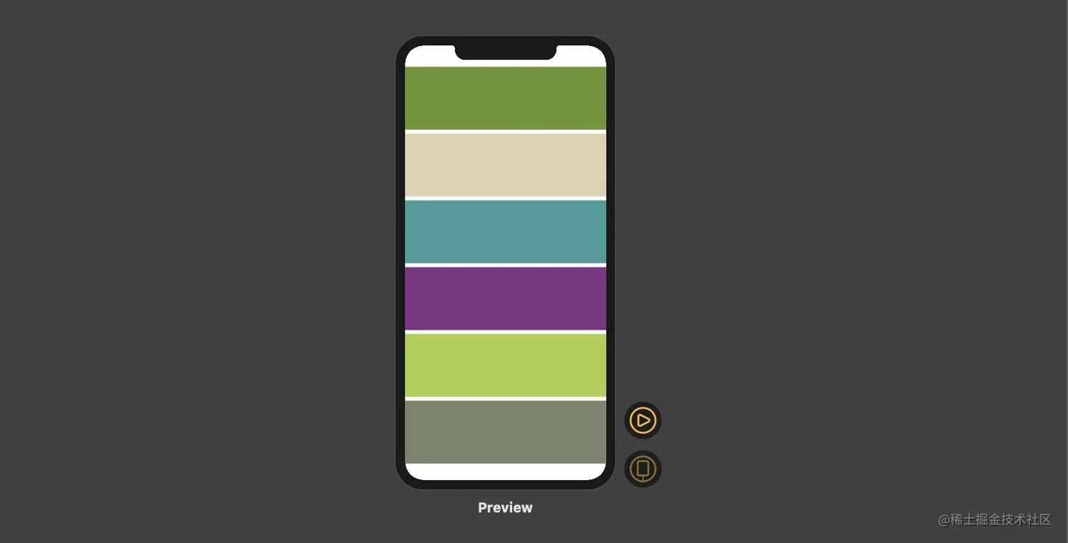 想必 HStack 横向布局与 VStack 竖向布局你们已经掌握得很熟练了,比如竖向排列 6 个 Color 视图。