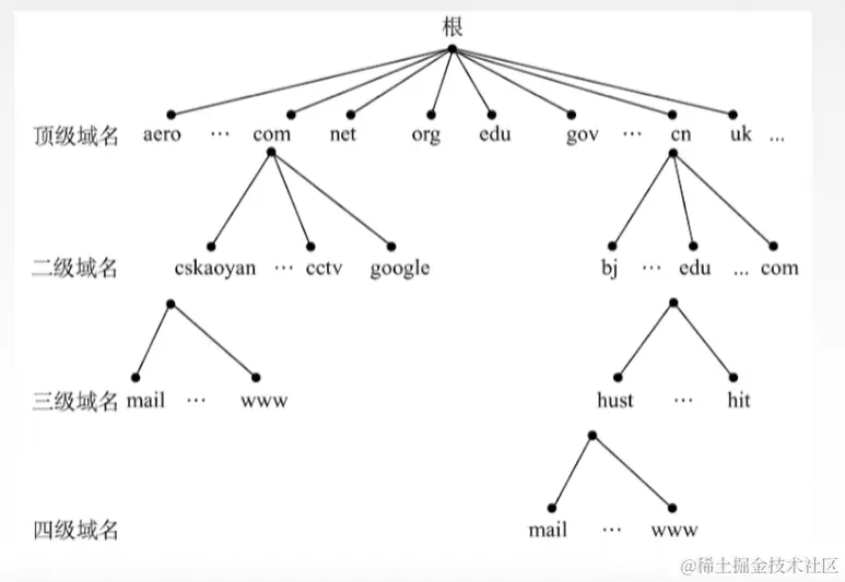 - 顶级域名服务器:管理该顶级域名服务器注册的所有二级域名