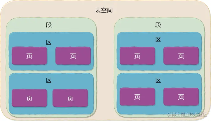 从InnoDB逻辑存储结构来看,InnoDB所有数据都存放到在一个空间中,称之为表空间。如图所示,表空间由段、区、页组成。