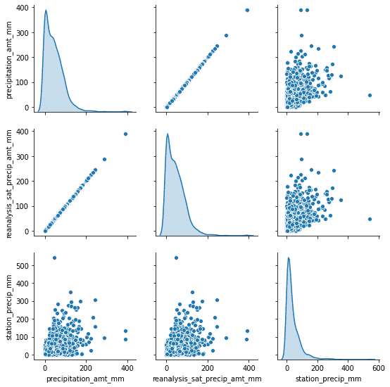 sns.pairplot(dataset[["precipitation_amt_mm", "reanalysis_sat_precip_amt_mm", "station_precip_mm"]], diag_kind="kde")