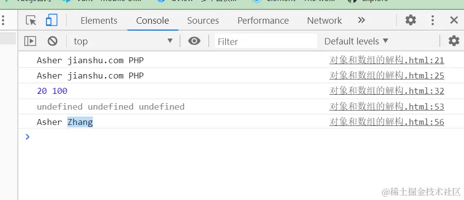 console.log(name, website, lan); //Asher jianshu.com PHP
