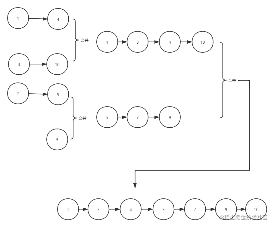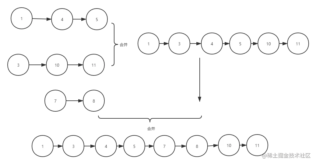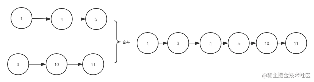 这里先来个简化版,先来看看如何实现两个排序链表合并。如图