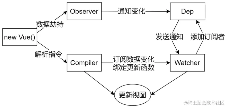 当数据发生改变时,进入到obserer中的set方法,对数据进行更新,随后进入到dep.notify方法,遍历所有观察者对象,调用每个对象的update方法,在watcher的update方法中,对数据进行更新,随后调用回调函数,在compiler中对应的watcher对象生成的韦志中对新值进行赋值,并对视图中的内容进行更新。