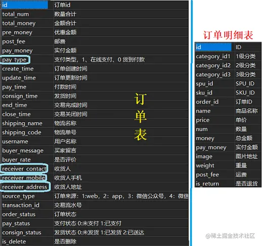 和订单有关的有两张表,订单是点击下单后生成的记录,比如我一次性下单10件商品,就是一个订单,但是生成了10个订单明细。其中,支付类型,收货人,收货人手机,收货人地址是前端传过来的,其它的信息则是由后端去完善的。
