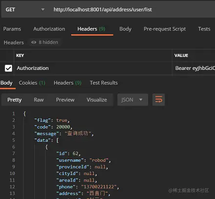 不论是在京东还是淘宝下单,都会去选择收货地址,那这些收货地址信息都是保存在MySQL中的,所以第一步要实现查询收货地址的功能。思路就是通过用户名去查询出收货地址,但并不是前端将用户名传到服务器,而是直接解析Token拿到用户名,然后再去查询数据库,这样做的好处就是安全。实现起来很简单,直接上代码。解析Token用的还是之前写的工具类。