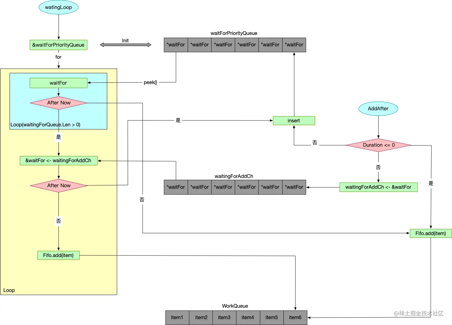 该方法初始化了waitingForAddCh(大小为1000的缓冲通道)channel,并在goroutine中执行了waitingLoop()。可以结合AddAfter方法来理解waitingForAddCh的作用。