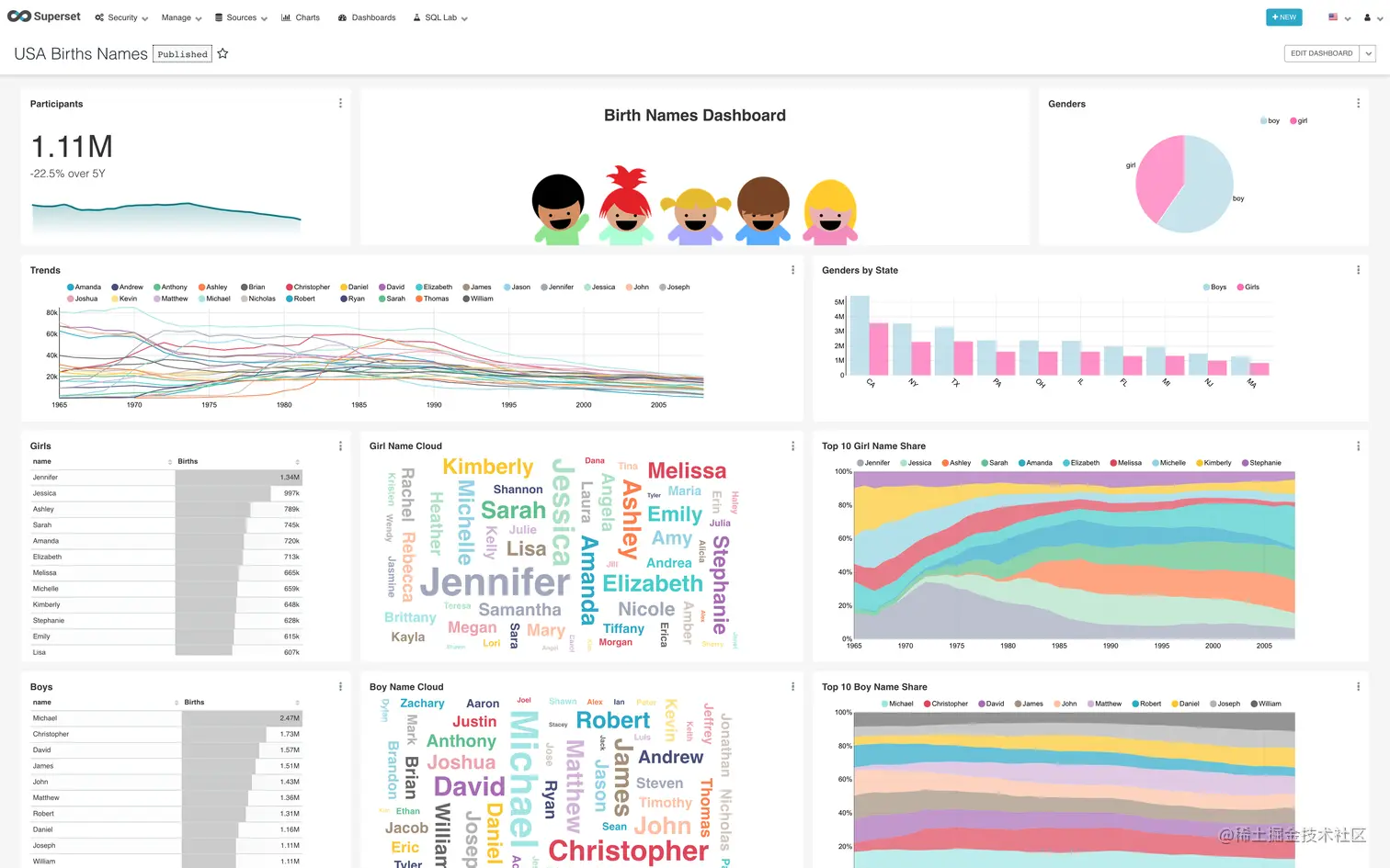 理论上,我们打开http://127.0.0.1:8088/superset/dashboard/births/,即可看到如下图所示:
