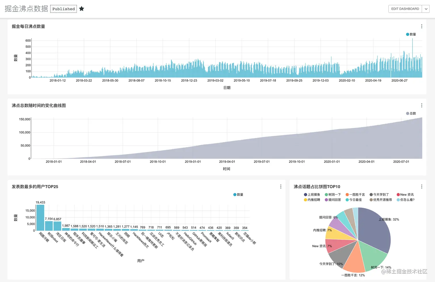 可能的话,后台专门跑个服务对沸点数据进行定时抓取和更新,并制作数据大屏进行展示。