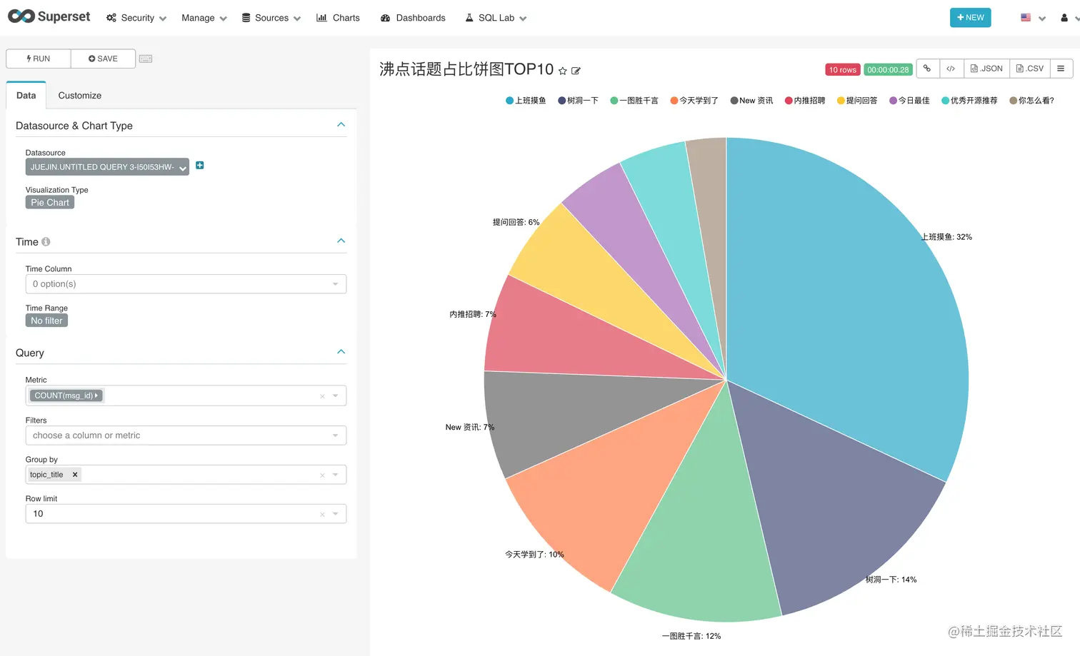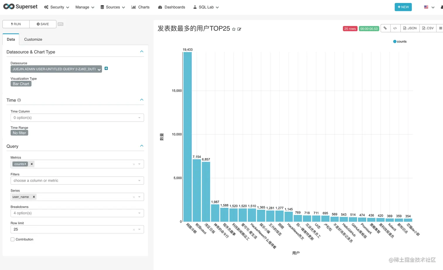 Superset图表的制作可以由数据库表直接生成。这里咱们选择更通用的一种方式,由SQL Lab -> SQL Editor通过SQL来直接获取目标数据。