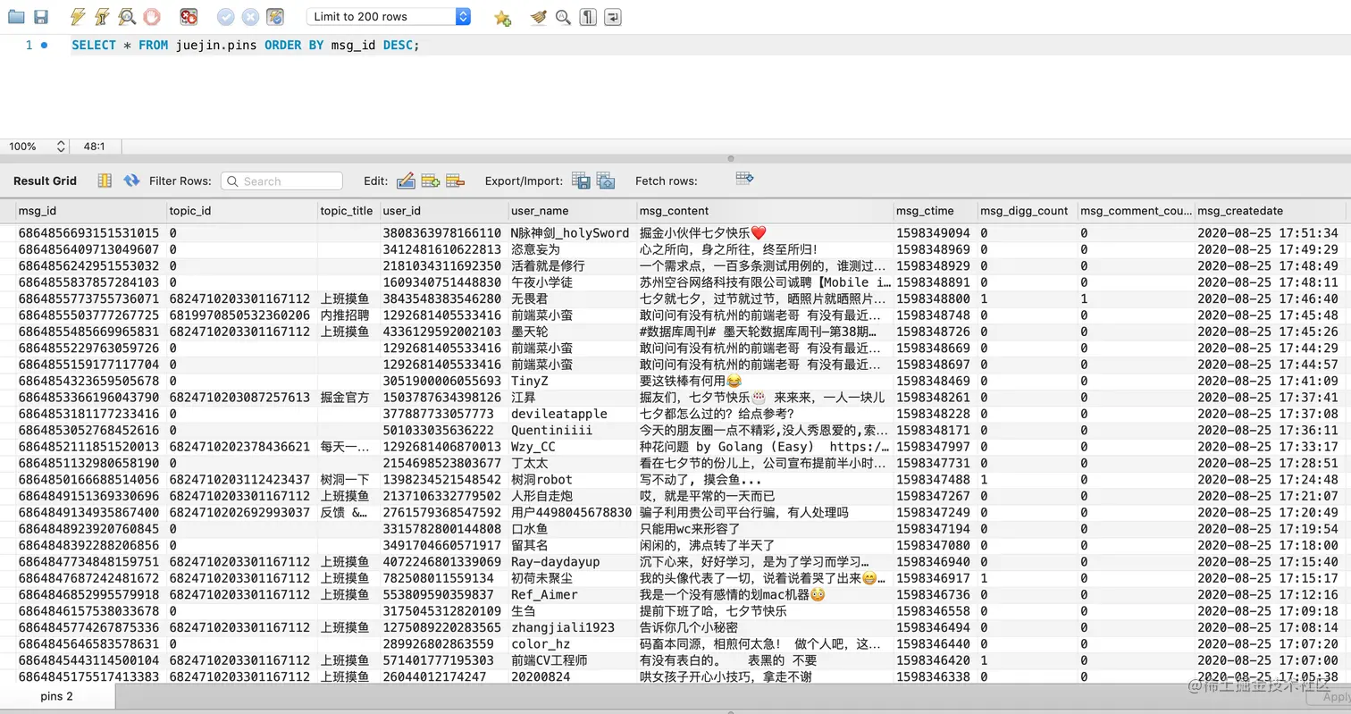 数据库的话,使用MySQL。因为沸点内容msg_content中含有emoji表情,所以在建表时字符集编码需要使用utf8mb4。