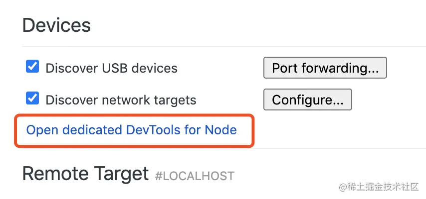 打开浏览器访问chrome://inspect,点击图中位置,即可打开debugger 窗口。