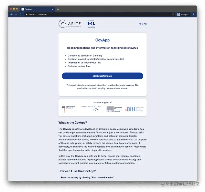真正的考验出现在我们与柏林Charité大学医院的合作中。我们的任务是创建一个应用程序,让人们回答有关冠状病毒(COVID-19)症状的问题。在填写完数字问卷后,用户会收到一个建议,可以去医院看病,也可以呆在家里,还可以给医生看个人症状总结。