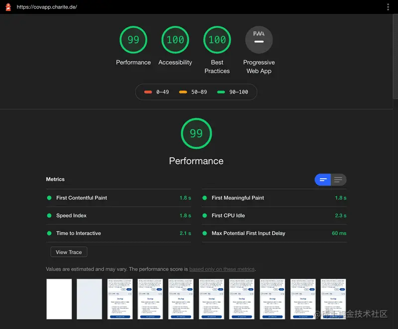 由于性能和可访问性是我们从一开始就融入开发流程的主题,因此我们在关键性能指标 "交互时间"(3G/首次加载时低于2.5秒)和 "首次有内容的绘画"(3G/首次加载时低于2秒)上取得了理想的完美成绩。