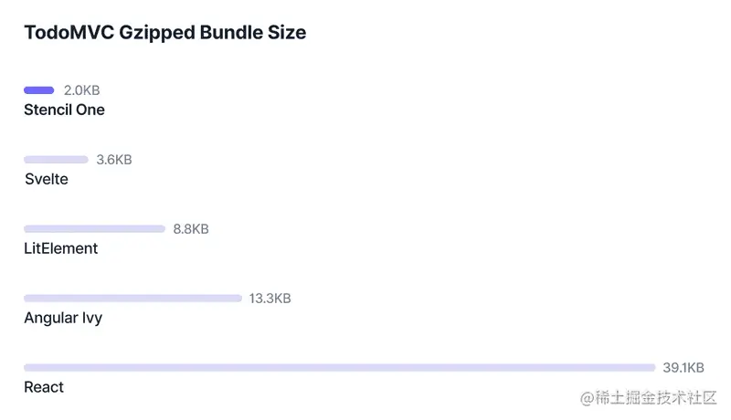 我们在选择创建Web Components的工具时,另一个重要的考虑因素是应用程序的捆绑大小。由于Stencil是一个构建时工具,所以代码足迹在我们性能预算的可接受范围内。Stencil团队还提供了Stencil与其他流行的JavaScript框架的捆绑大小基准比较。