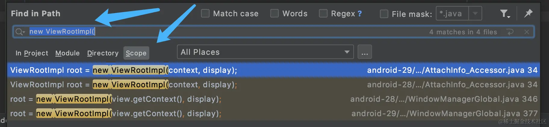 然后我们全局搜索关键字 new ViewRootImpl 这个关键字,也就是创建时。我们可以看到只有两个类去实例化了这个类。当我们看到 WindowMangerGlobal,就知道和 WindowMange 和 Window有关系,所以我们直接看这个里面的代码。咱们的View都是添加到 Window上的。咱们每个Activity 都至少有一个Window,然后window 是 由WindowManger添加的,咱们都知道当Activity在onResume,中才会显示第一帧,此时在这里创建了ViewRootImpl。具体可查看具体分析