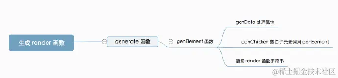 生成 render 的 generate 函数的输入也是 AST,它递归了 AST 树,为不同的 AST 节点创建了不同的内部调用方法,等待后面的调用。生成 render 函数的过程如下: