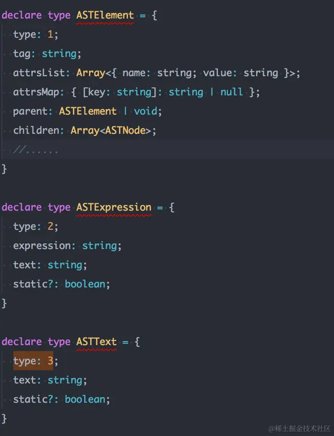 AST有三种类型,并且通过children这个字段层层嵌套形成了树状的结构。而每一个AST节点存放的就是我们的HTML元素、插值表达式或文本内容。AST正是parse函数生成和返回的。 -