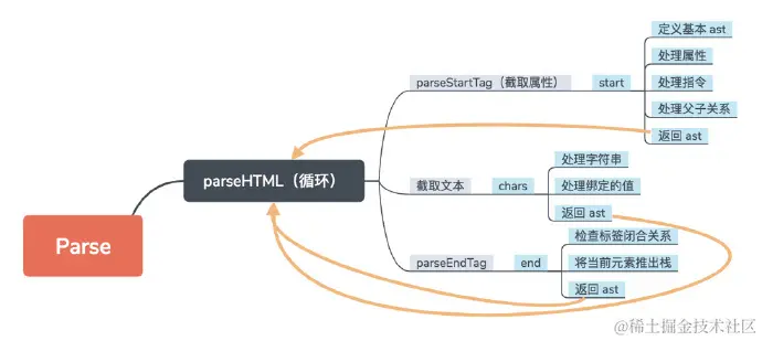 我们可以把这个过程理解为一个截取的过程,它把 template 字符串里的元素、属性和文本一个个地截取出来,其中的细节十分琐碎,涉及到各种不同情况(比如不同类型的 v-for,各种 vue 指令、空白节点以及父子关系等等)。