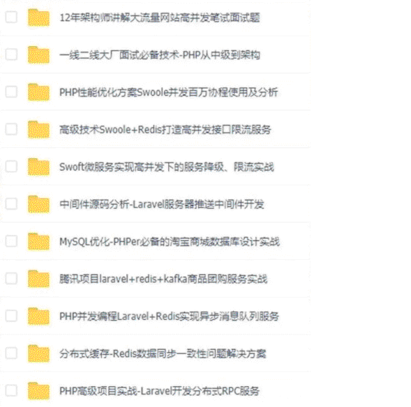 ★官方PHP高级学习交流社群「点击」管理整理了一些资料,BAT等一线大厂进阶知识体系备好(相关学习资料以及笔面试题)以及不限于:分布式架构、高可扩展、高性能、高并发、服务器性能调优、TP6,laravel,YII2,Redis,Swoole、Swoft、Kafka、Mysql优化、shell脚本、Docker、微服务、Nginx等多个知识点高级进阶干货