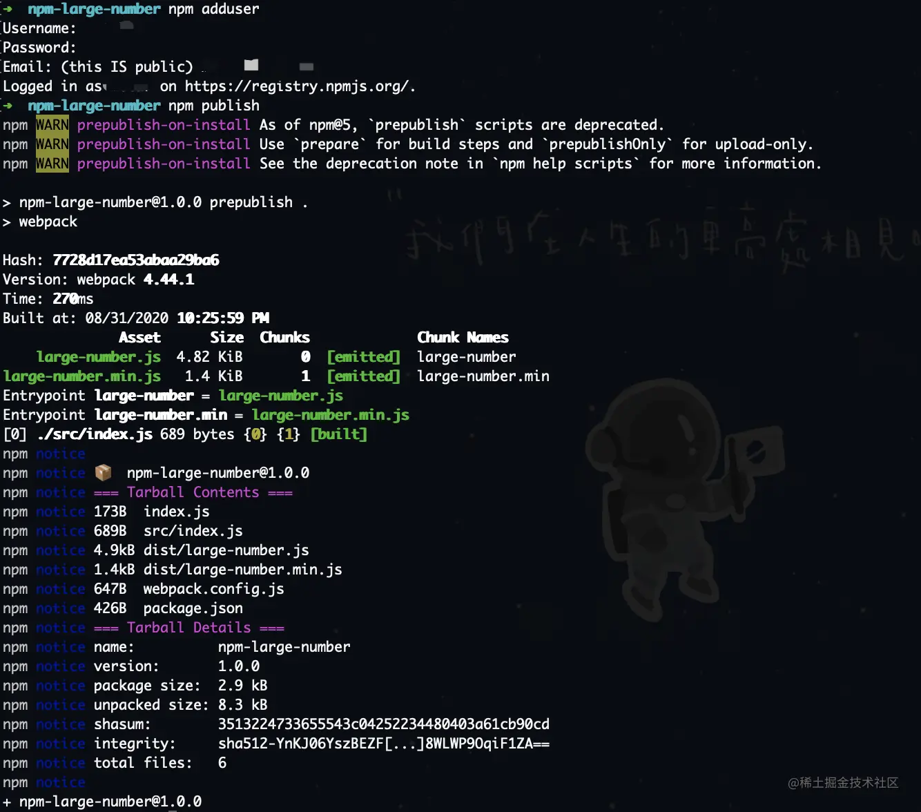 - 执行npm adduser,输入用户名、密码和邮箱