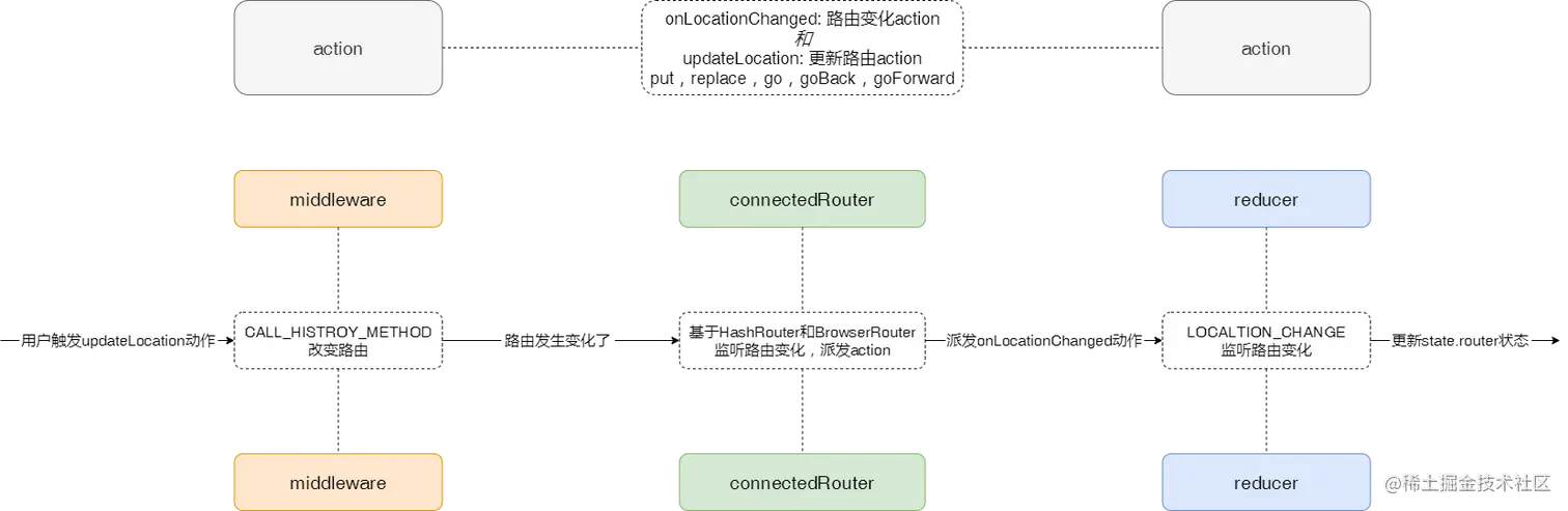 - 可以通过 redux 派发一个跳转路由的请求,并且更新 state.router