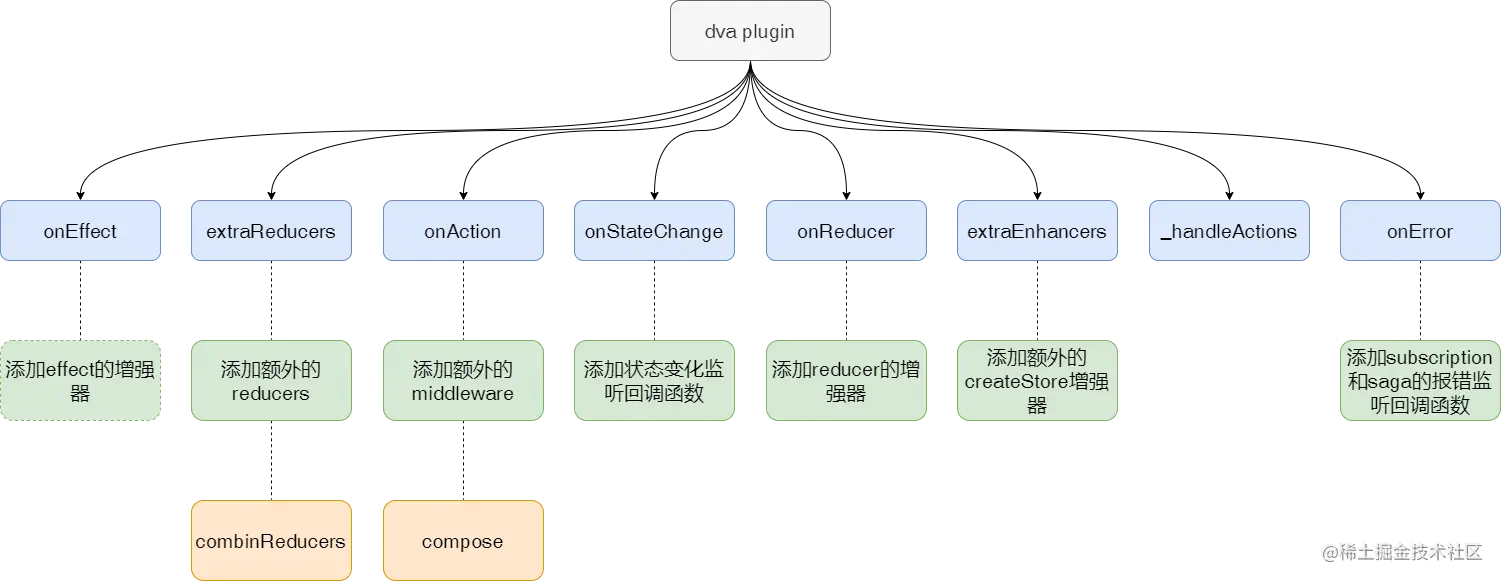 ❝有webpack的插件机制内味了,就是在dva应用运行的流程中,插入一些钩子函数。用户可以利用这些钩子函数或是增强reducer、增强effects、添加额外中间件、添加额外reducer、添加额外createStore增强器、状态变化回调、抛错处理等等
