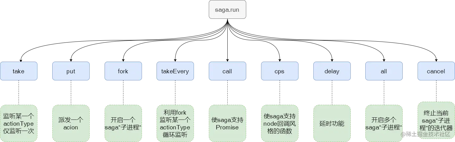 就是一个使用了 ES6 的 Generator 功能的中间件,所以 saga 充分利用了 Generator 的特性,使得 redux 像注入了灵魂一样,无论是使用还是维护都很有章法