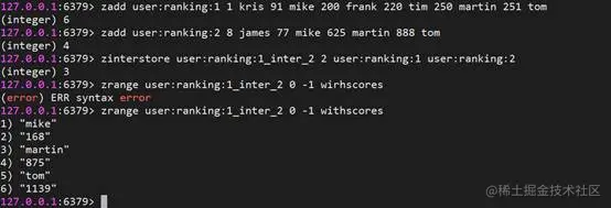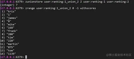 下面操作对user:ranking:1和user:ranking:2做交集,weights和aggregate使用了默认配置,可以看到目标键user:ranking:1_inter_2对分值做了sum操作