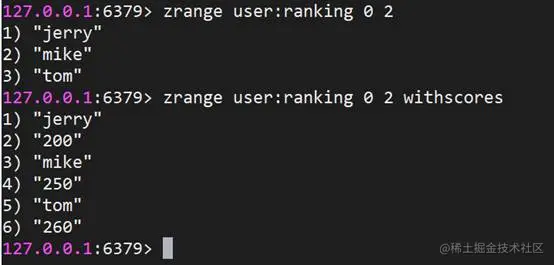 有序集合是按照分值排名的,zrange是从低到高返回,zrevrange反之。下面代码返回排名最低的是三个成员,如果加上withscores选项,同时会返回成员的分数: