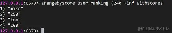 其中zrangebyscore按照分数从低到高返回,zrevrangebyscore反之。例如下面操作从低到高返回200到221分的成员,withscores选项会同时返回每个成员的分数。[limit offset count]选项可以限制输出的起始位置和个数。同时min和max还支持开区间(小括号)和闭区间(中括号),-inf和+inf分别代表无限小和无限大