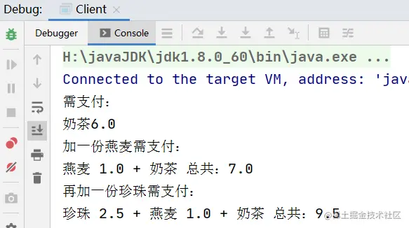 第三步:客户在加了燕麦的奶茶基础上,点了一个珍珠。此时我们需要装饰的就是第二步中加了燕麦的奶茶了(将其视为一个整体)。自此整个订单完成,得到一个加了燕麦和珍珠的奶茶(装饰完成)。
