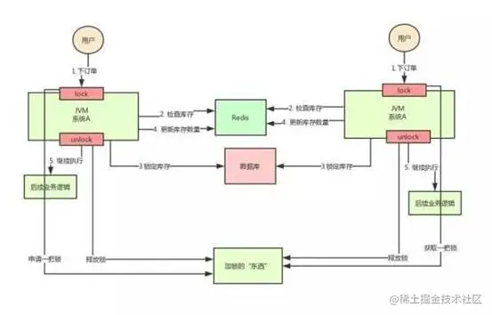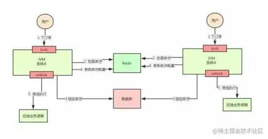 因此,这里的问题是:Java 提供的原生锁机制在多机部署场景下失效了,这是因为两台机器加的锁不是同一个锁(两个锁在不同的 JVM 里面)。