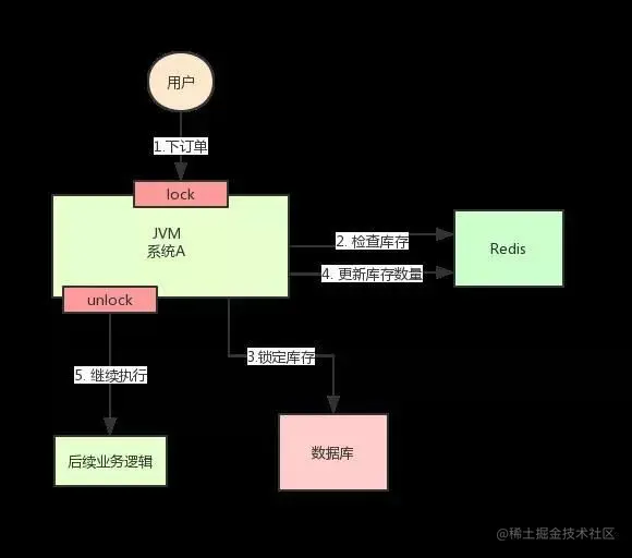 系统 A 是一个电商系统,目前是一台机器部署,系统中有一个用户下订单的接口,但是用户下订单之前一定要去检查一下库存,确保库存足够了才会给用户下单。由于系统有一定的并发,所以会预先将商品的库存保存在 Redis 中,用户下单的时候会更新 Redis 的库存。此时系统架构如下: