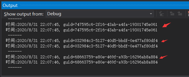前面大家也看到了,要么作用域是整个进程,要么作用域是一个请求,而这里的 Transient 就没有作用域概念了,注入一次 实例化一次,不信的话上代码给你看呗。