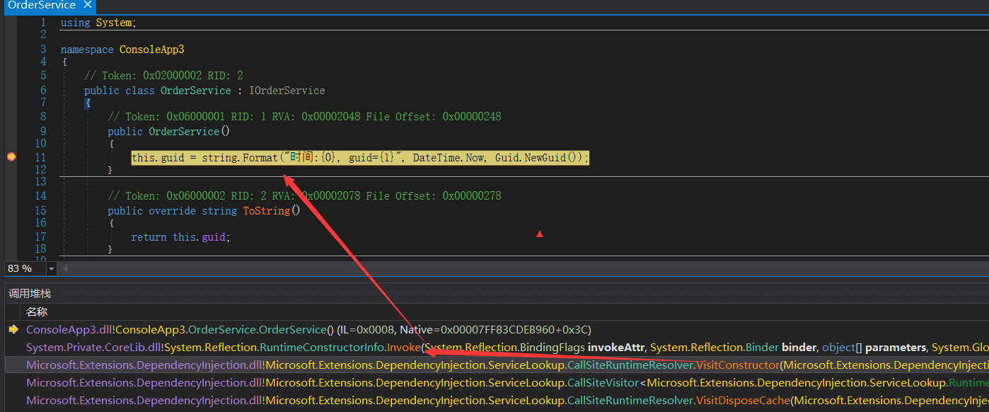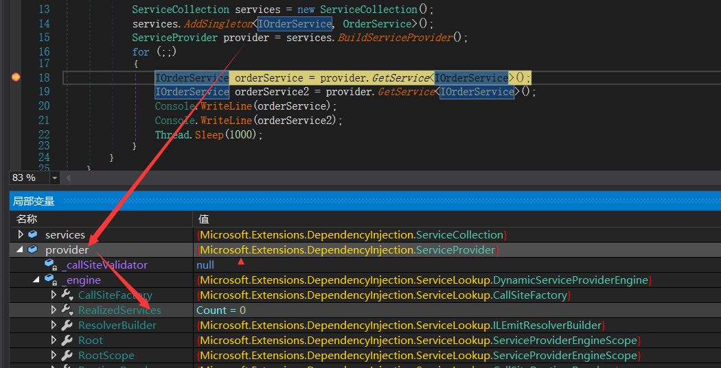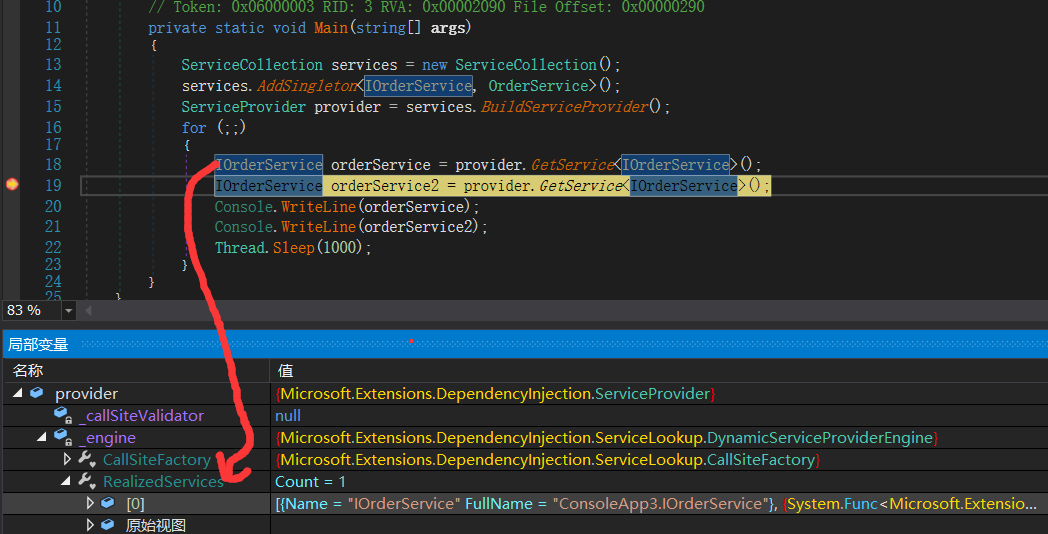 从上图中可以看到,初始化的时候这个字典什么都没有,接下来执行 var orderService = provider.GetService<IOrderService>(); 效果如下图: